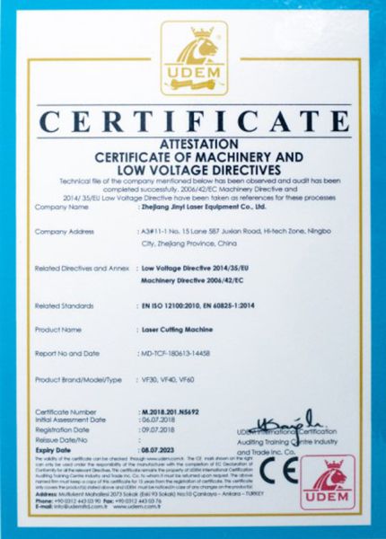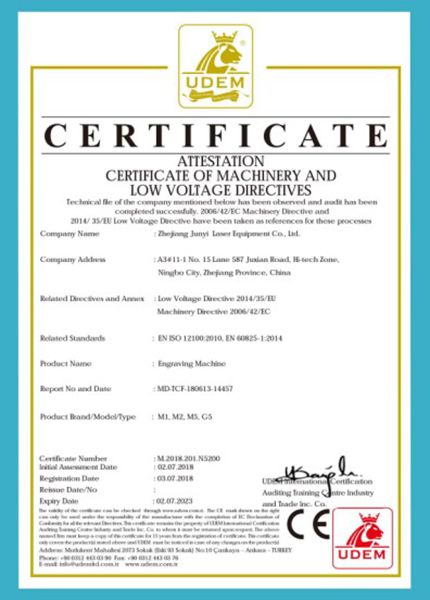 Все станки для лазерной резки JUNYI сертифицированы в соответствии со стандартами безопасности, установленными директивой ЕС, что обеспечивает пользователям безопасность эксплуатации.